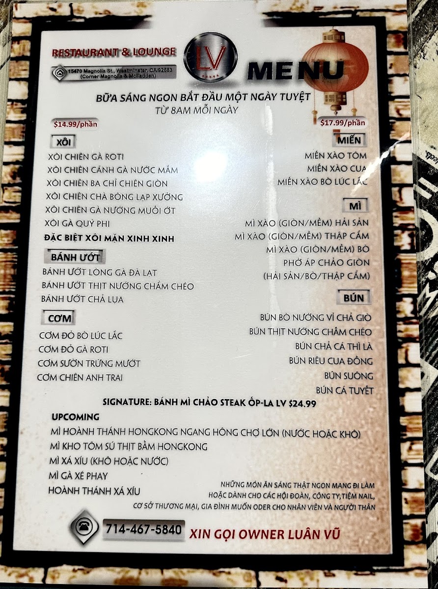 When you're in the mood for a laid-back yet vibrant dining experience, Lv Restaurant & Lounge Menu is the place to be. Nestled in the heart of Westminster, this cozy spot offers a range of dishes perfect for every craving. Whether you're a fan of savory appetizers, hearty main courses, or something to sip while you unwind, the menu has something for everyone. From fresh salads to tender steaks and flavorful seafood, every bite promises to satisfy. And don't forget to check out their signature cocktails, which perfectly complement the food. Whether you're grabbing a casual meal with friends or enjoying a special night out, you'll find yourself coming back for more at this local gem.